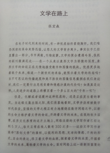 但是,化解或者说缓冲这种忧虑的,还是正在发生着的事实。当这部文集出版之际,我们欣喜地看到,文学并没有被数字时代吞没,坚强的文学之根正有力地缠绕在数字网络之中,以新的生命力维护着文学的命运,开辟着文学的未来。在我的故乡淄博,在齐文化养育的这片土地上,网络注册的文学写作者已经达到5万人,每天正常在线人数有300之多……这些文学写作者高举"原创文学"的旗帜,以锐利的思想、充沛的情感、不拘的形式、自由的表达,捍卫着文学的血统,探索着文学的本质,开掘着文学的未来,蓬勃着文学的生命。面对网络上这一崭新而重要的文学事实,我们必须承认,这样的努力不是徒劳,不是虚拟,而是一种开创性的劳动,一种扎实有效的成果。我甚至这样来看待,这样的努力不仅仅在于拯救文学在当前的命运,而且,开始进一步刷新文学在当代的意义。它首先这样证明,技术主义永远不可以全部占领一个时代,它可以领导时代先锋,却不能奠基时代底蕴;它可以标贴时代表象,却不能形成时代内核。数字也好,网络也好,都不能长期剥夺人们所需要的思想抚摸、道德慰藉、情感渴望、心灵关怀。活跃在网络上的这一切自发性的文学活动,正是文学命脉强有力的不可遏止的延伸。它不仅证明了文学生命的永恒性质,还在证明着文学传统生生不息、薪火相传的伟大传奇。与此同时,它还在独特地证明,文学的承袭不是简单的衣钵相传,不是一成不变的翻版复制。它至少从书写方式和传播方式上证明了文学的再生能力和创造空间,证明了文学本