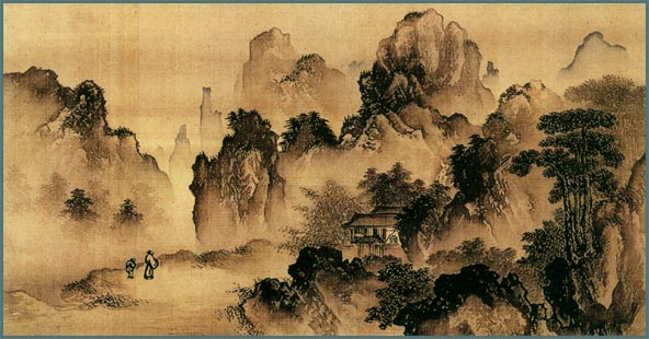 此图夏芷抽作。写灵阳山明水秀之景。屋字以界画法为之。层峦列 则以斧劈皴擦山头,继以淡墨接染,渐次虚淡,至山脚 恍若云雾弥漫。画面具空明朗润之境,颇得戴进真传。