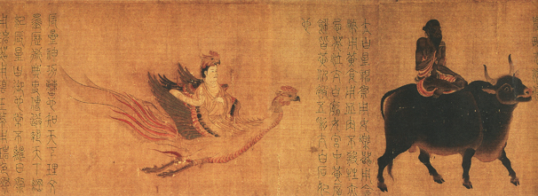 此图原分为上下两卷,前画五星,后画二十八宿。五星,亦称五纬,谓金木水火土五行星;二十八宿,我国古时天文学家将周天的恒星分为三垣二十八宿,而附以诸星座。在古代观天历算的经典作品中,多将五星二十八宿画为人形、兽形、鸟形等。此图现只存在五星及“角”至“危”十二宿神形,计十七图,当是上卷。每个星、宿各作一图,或作老人,或作女像,或作怪异形象。人物有的骑牛,有的手执器物,面部特征也各有不同。用笔细劲而圆转,粗细一致。设色以黄色为基调,另有朱、青、绿、黑各色配合。衣褶、人体和兽身均采用晕染法,略有立体感。此卷曾藏宋内府,《宣和画谱》著录为张僧繇作,根据卷首题跋其说有误。