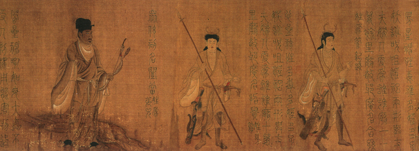 此局部图所示为,唐代梁令瓒的《五星二十八宿神形图》中东方苍龙七宿的房宿、心宿、尾宿三星神。图左一为尾星神。传说尾星神前身本是一虎,后修道成神,为火部正神之一。图中为心星神。传说心星神前身本是一狐狸,后修道成神,行走时如掣电一般,须庾即到。图右为房星神,传说前身为兔,常随一道人修炼,后得食长生之药,修成人身,续修成神,练就口吐三昧真火等众多神功,出行时身前身后一百步都在霞光中。美丽的传说,终归为人们心中,对一些美好的事物加注寄托和向往。但藉由作者的妙手,将其跃然纸上,令虚缈的故事,剎那间变得真实又不乏空灵之美。这幅长达数米的创作,品之令人叹为观止。人有神,天地万物皆有神,中国绘画重在表现对象的内在精神,以画传神,以形传神,这就是中国画的魅力,历转千年而不衰,生生不息,历久弥新。