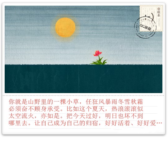 你就是山野里的一棵小草,任狂风暴雨冬雪秋霜,必须奋不顾身承受。比如这个夏天,热浪滚滚似太空流火,亦如是。把今天过好,明日也坏不到哪里去。让自己成为自己的归宿,好好活着、好好爱……
